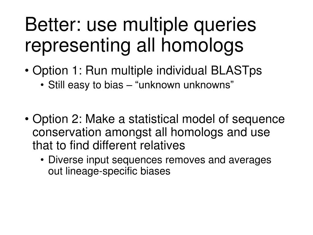 Better: use multiple queries representing all homologs • Option 1: Run multiple individual BLASTps • Still easy to bias – “unknown unknowns” • Option 2: Make a statistical model of sequence conservation amongst all homologs and use that to find different relatives • Diverse input sequences removes and averages out lineage-specific biases