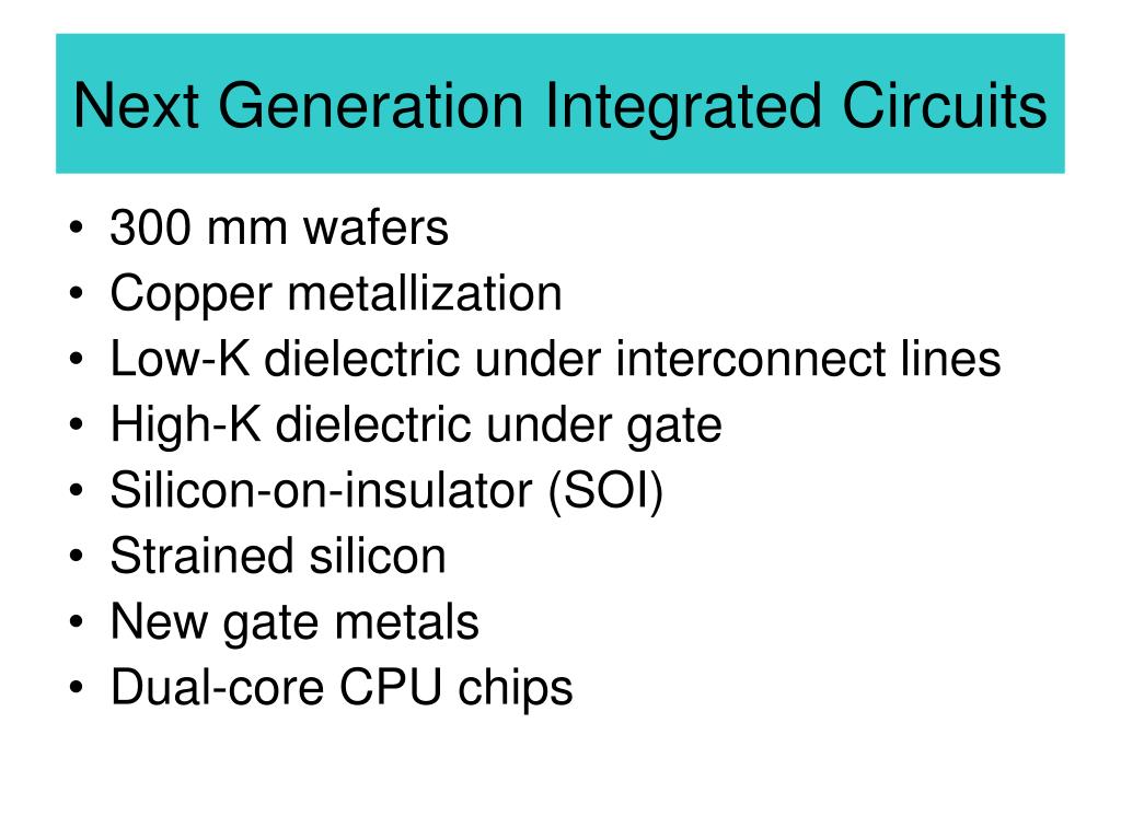 Next Generation Integrated Circuits. 300 mm wafers Copper metallization Low-K dielectric under interconnect lines High-K dielectric under gate Silicon-on-insulator (SOI) Strained silicon New gate metals Dual-core CPU chips. Next Generation Integrated Circuits. 300 mm wafers