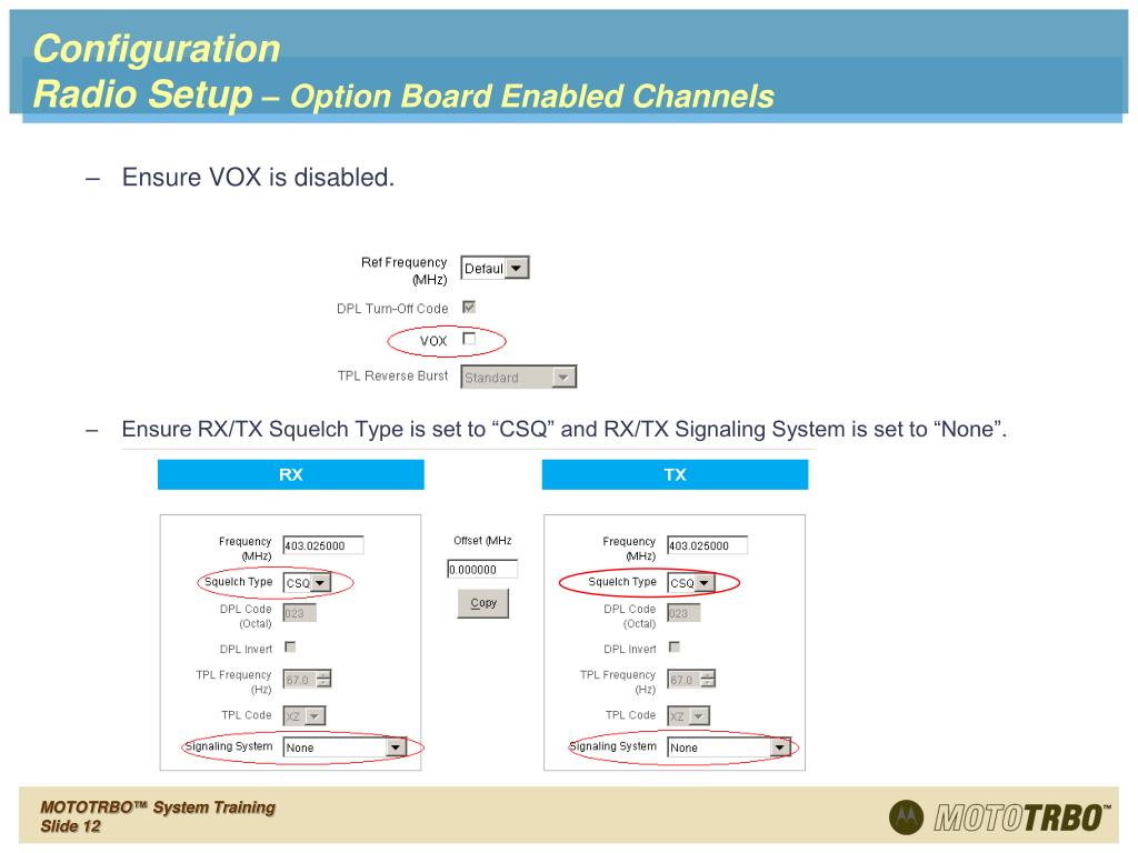 ConfigurationRadio Setup – Option Board Enabled Channels • Ensure VOX is disabled. • Ensure RX/TX Squelch Type is set to “CSQ” and RX/TX Signaling System is set to “None”.