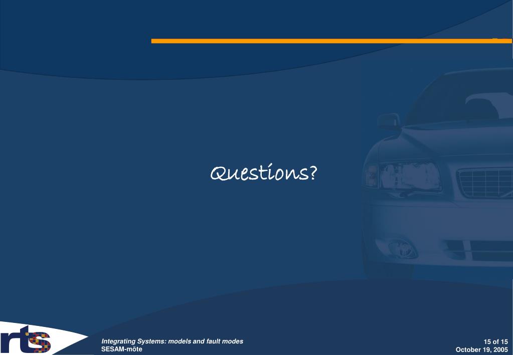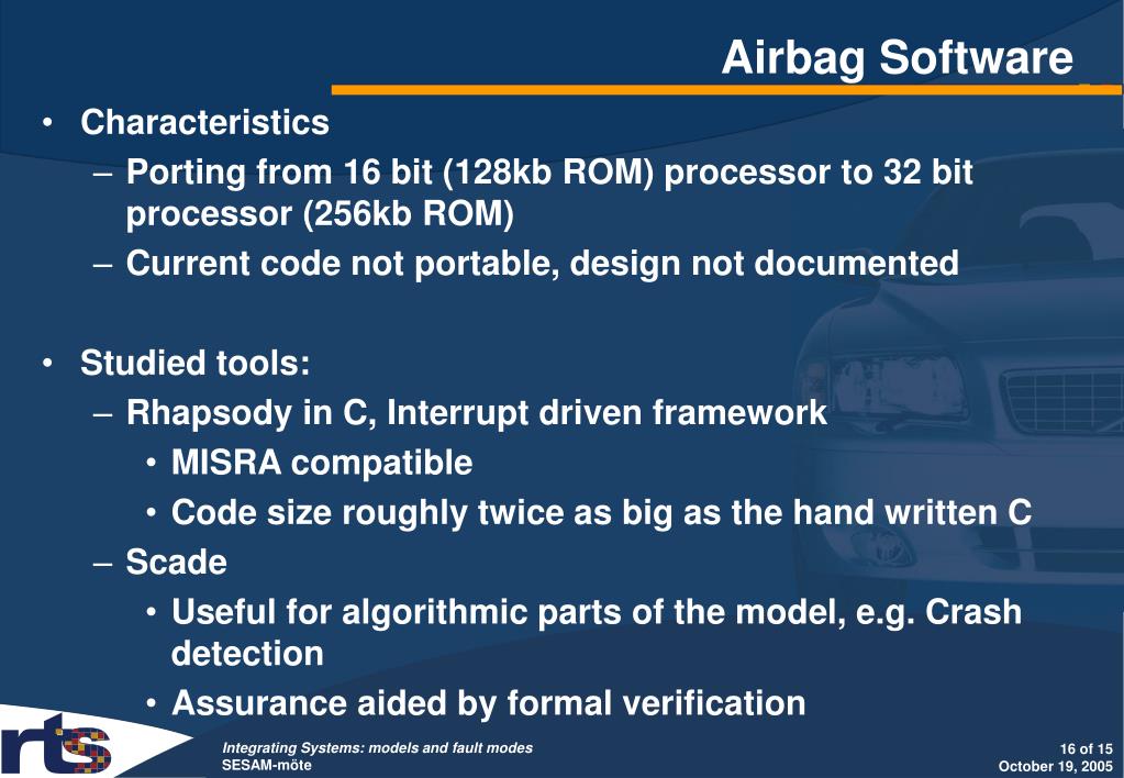 Airbag Software • Characteristics • Porting from 16 bit (128kb ROM) processor to 32 bit processor (256kb ROM) • Current code not portable, design not documented • Studied tools: • Rhapsody in C, Interrupt driven framework • MISRA compatible • Code size roughly twice as big as the hand written C • Scade • Useful for algorithmic parts of the model, e.g. Crash detection • Assurance aided by formal verification