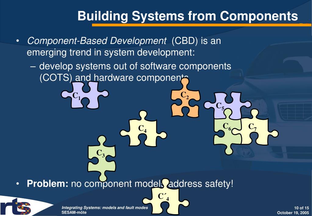 C2 C1 C´4 C4 C3 Building Systems from Components • Component-Based Development (CBD) is an emerging trend in system development: • develop systems out of software components (COTS) and hardware components • Problem: no component models address safety! C5 C6 C7