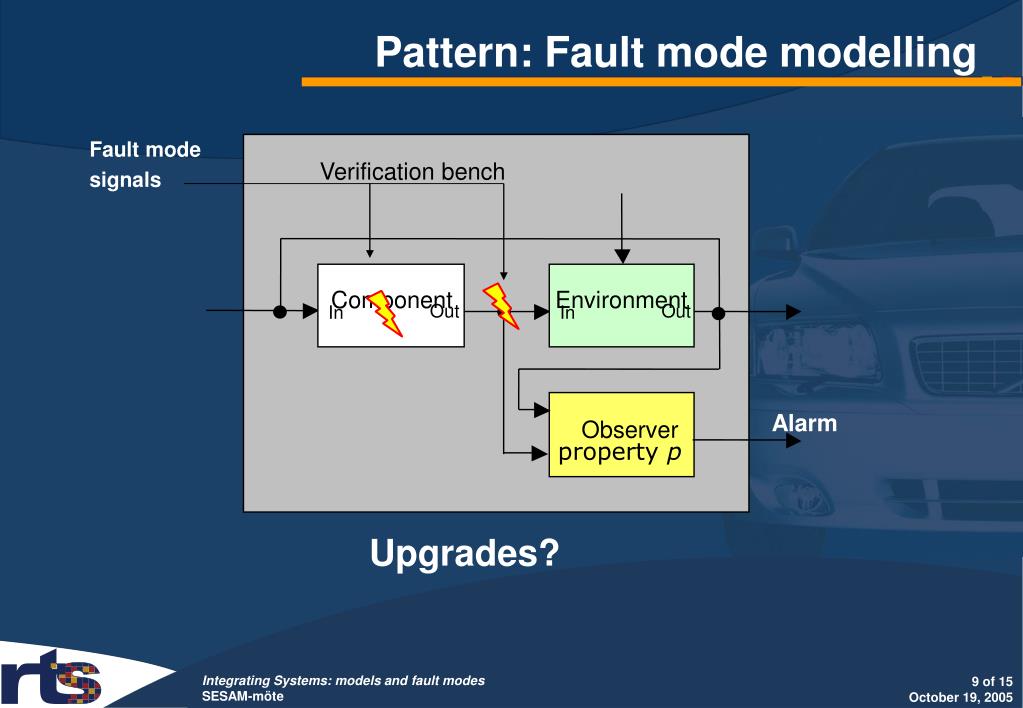 Upgrades? Verification bench Component Environment Out Out In In Alarm Observer property p Pattern: Fault mode modelling Fault mode signals