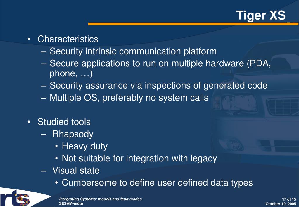 Tiger XS • Characteristics • Security intrinsic communication platform • Secure applications to run on multiple hardware (PDA, phone, …) • Security assurance via inspections of generated code • Multiple OS, preferably no system calls • Studied tools • Rhapsody • Heavy duty • Not suitable for integration with legacy • Visual state • Cumbersome to define user defined data types
