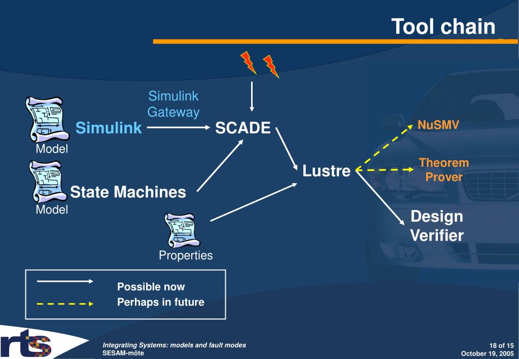 Simulink Gateway NuSMV Theorem Prover Lustre Design Verifier Properties Model Model Tool chain Possible now Perhaps in future Simulink SCADE State Machines