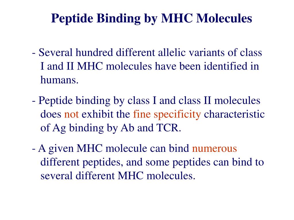 Peptide Binding by MHC Molecules • Several hundred different allelic variants of class • I and II MHC molecules have been identified in • humans. • Peptide binding by class I and class II molecules • does notexhibit thefine specificitycharacteristic • of Ag binding by Ab and TCR. • A given MHC molecule can bindnumerous • different peptides, and some peptides can bind to • several different MHC molecules.
