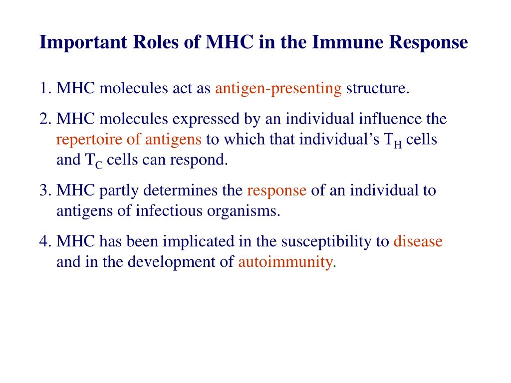 Important Roles of MHC in the Immune Response 1. MHC molecules act asantigen-presenting structure. 2. MHC molecules expressed by an individual influence the repertoire of antigensto which that individual’s TH cells and TC cells can respond. 3. MHC partly determines theresponseof an individual to antigens of infectious organisms. 4. MHC has been implicated in the susceptibility todisease and in the development ofautoimmunity.