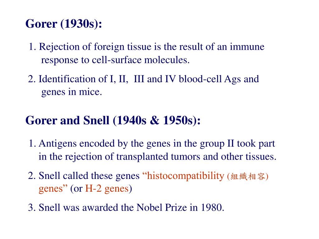 Gorer (1930s): 1. Rejection of foreign tissue is the result of an immune response to cell-surface molecules. 2. Identification of I, II, III and IV blood-cell Ags and genes in mice. Gorer and Snell (1940s & 1950s): 1. Antigens encoded by the genes in the group II took part in the rejection of transplanted tumors and other tissues. 2. Snell called these genes“histocompatibility (組織相容) genes” (orH-2 genes) 3. Snell was awarded the Nobel Prize in 1980.