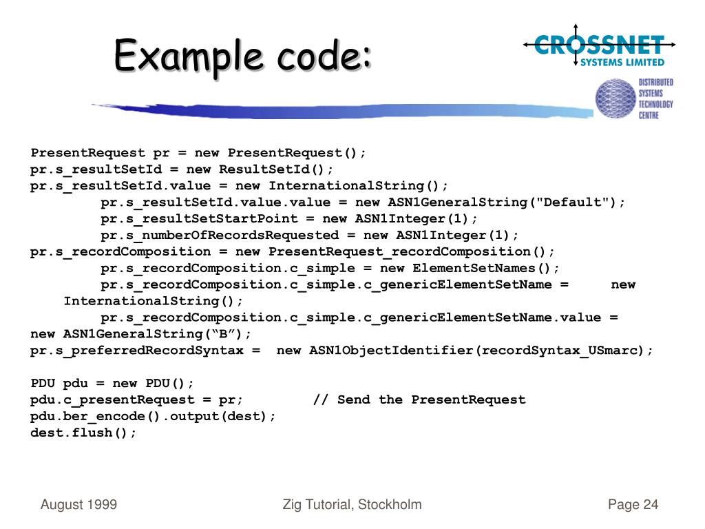 Example code: PresentRequest pr = new PresentRequest(); pr.s_resultSetId = new ResultSetId(); pr.s_resultSetId.value = new InternationalString(); pr.s_resultSetId.value.value = new ASN1GeneralString("Default"); pr.s_resultSetStartPoint = new ASN1Integer(1); pr.s_numberOfRecordsRequested = new ASN1Integer(1); pr.s_recordComposition = new PresentRequest_recordComposition(); pr.s_recordComposition.c_simple = new ElementSetNames(); pr.s_recordComposition.c_simple.c_genericElementSetName = new InternationalString(); pr.s_recordComposition.c_simple.c_genericElementSetName.value = new ASN1GeneralString(“B”); pr.s_preferredRecordSyntax = new ASN1ObjectIdentifier(recordSyntax_USmarc); PDU pdu = new PDU(); pdu.c_presentRequest = pr; // Send the PresentRequest pdu.ber_encode().output(dest); dest.flush(); Zig Tutorial, Stockholm