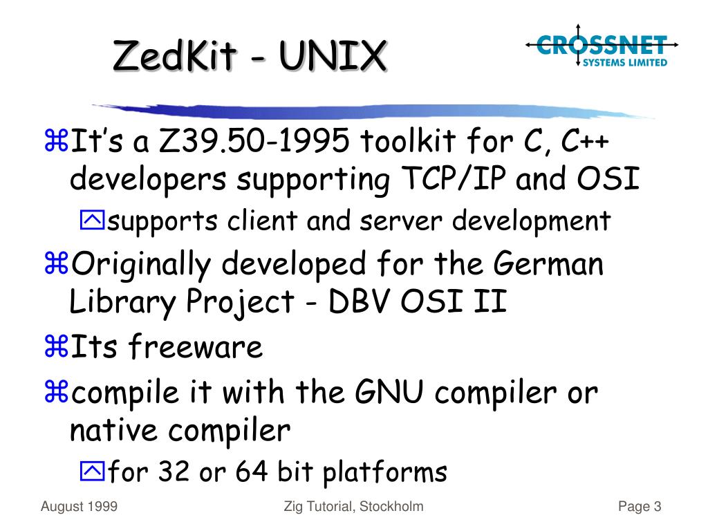 ZedKit - UNIX • It’s a Z39.50-1995 toolkit for C, C++ developers supporting TCP/IP and OSI • supports client and server development • Originally developed for the German Library Project - DBV OSI II • Its freeware • compile it with the GNU compiler or native compiler • for 32 or 64 bit platforms Zig Tutorial, Stockholm