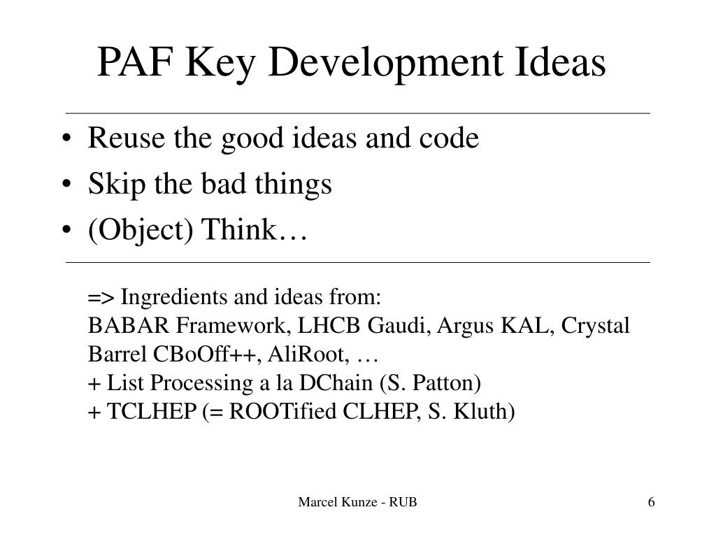 PAF Key Development Ideas • Reuse the good ideas and code • Skip the bad things • (Object) Think… => Ingredients and ideas from:BABAR Framework, LHCB Gaudi, Argus KAL, Crystal Barrel CBoOff++, AliRoot, …+ List Processing a la DChain (S. Patton)+ TCLHEP (= ROOTified CLHEP, S. Kluth) Marcel Kunze - RUB