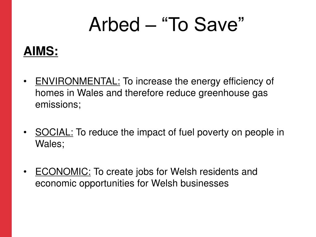 Arbed – “To Save” • AIMS: • ENVIRONMENTAL: To increase the energy efficiency of homes in Wales and therefore reduce greenhouse gas emissions; • SOCIAL: To reduce the impact of fuel poverty on people in Wales; • ECONOMIC: To create jobs for Welsh residents and economic opportunities for Welsh businesses