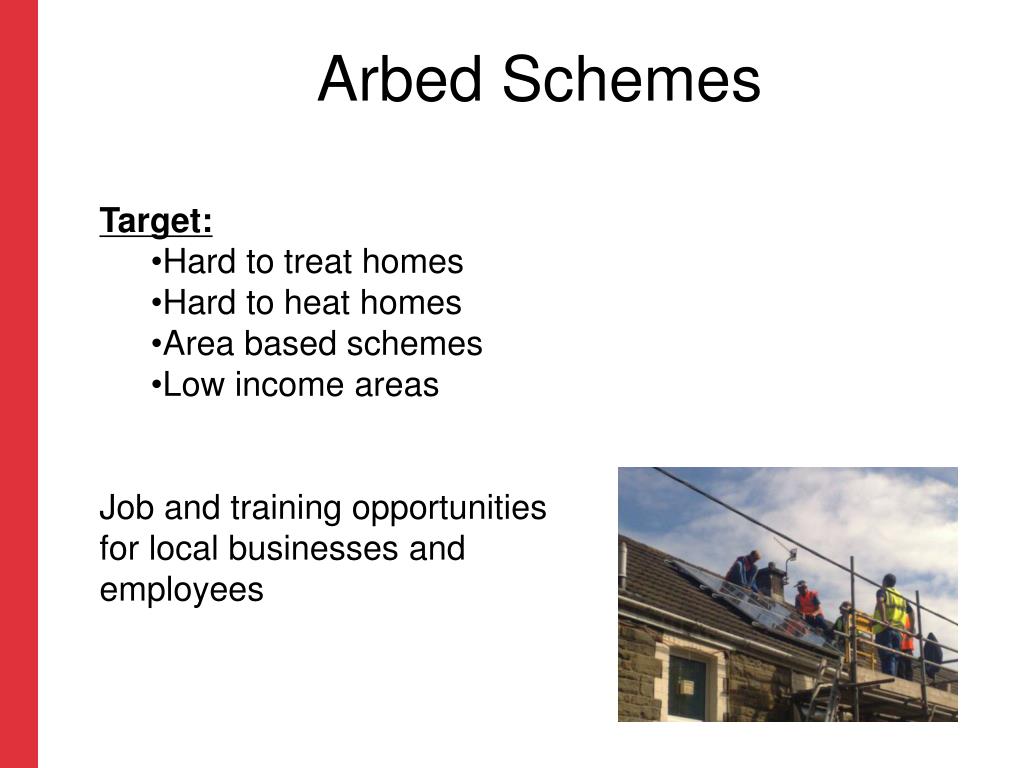 Arbed Schemes • Target: • Hard to treat homes • Hard to heat homes • Area based schemes • Low income areas • Job and training opportunities for local businesses and employees