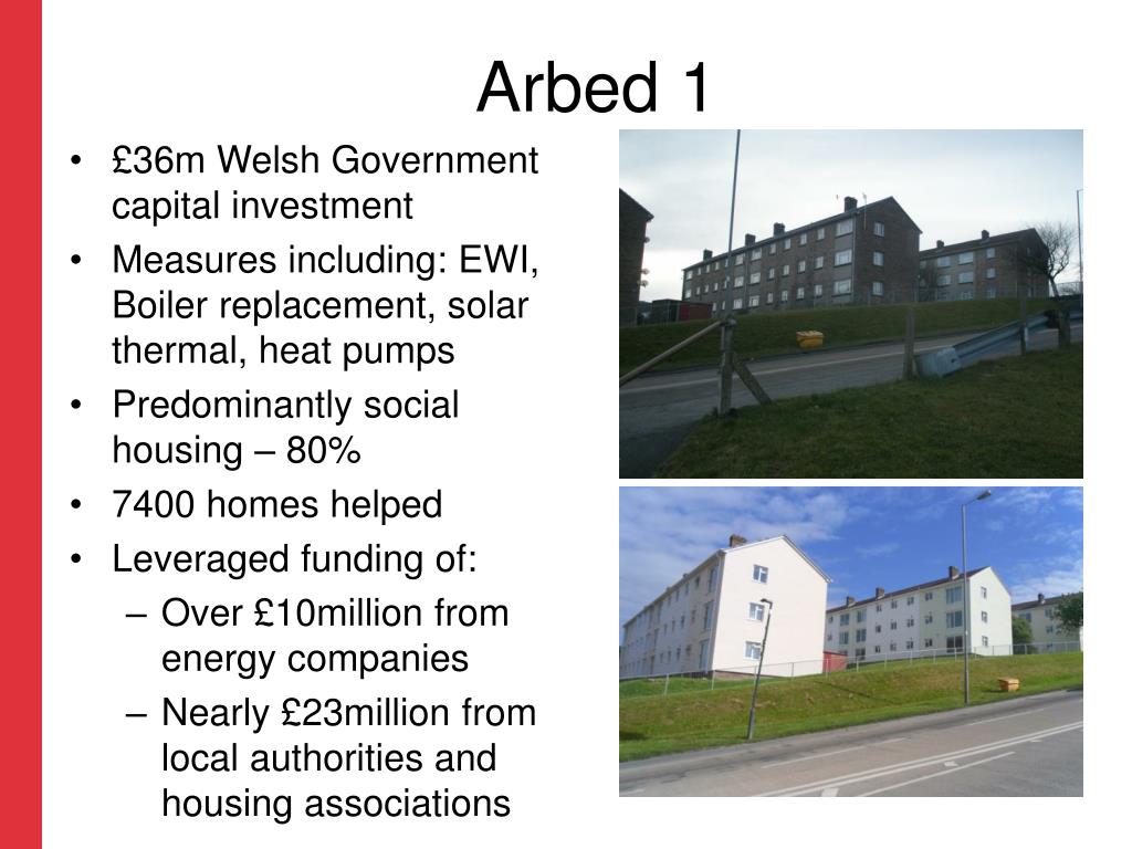 Arbed 1 • £36m Welsh Government capital investment • Measures including: EWI, Boiler replacement, solar thermal, heat pumps • Predominantly social housing – 80% • 7400 homes helped • Leveraged funding of: • Over £10million from energy companies • Nearly £23million from local authorities and housing associations
