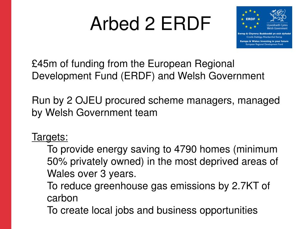 Arbed 2 ERDF • £45m of funding from the European Regional Development Fund (ERDF) and Welsh Government • Run by 2 OJEU procured scheme managers, managed by Welsh Government team • Targets: • To provide energy saving to 4790 homes (minimum 50% privately owned) in the most deprived areas of Wales over 3 years. • To reduce greenhouse gas emissions by 2.7KT of carbon • To create local jobs and business opportunities