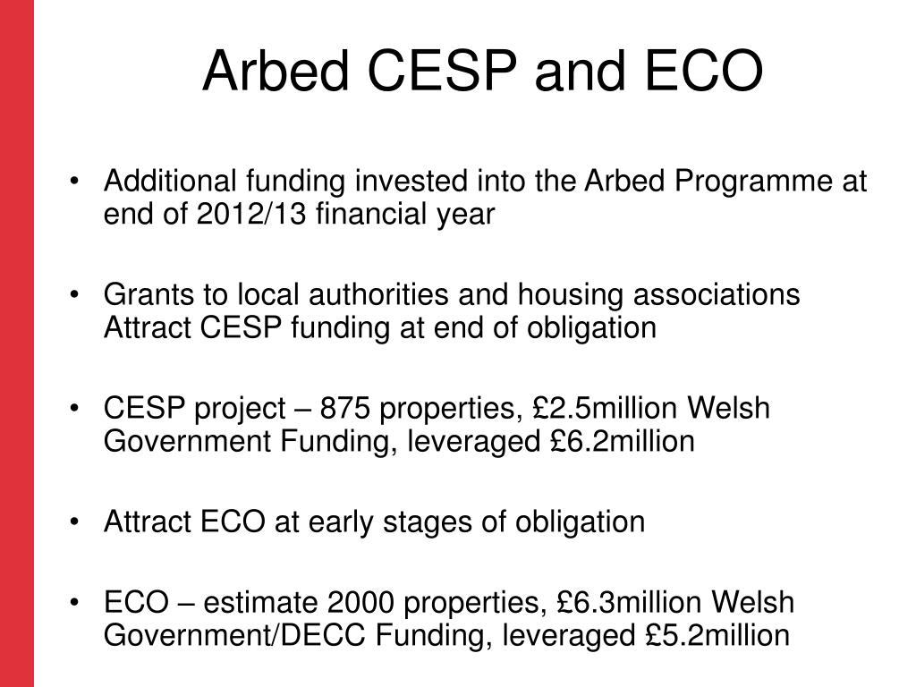 Arbed CESP and ECO • Additional funding invested into the Arbed Programme at end of 2012/13 financial year • Grants to local authorities and housing associations Attract CESP funding at end of obligation • CESP project – 875 properties, £2.5million Welsh Government Funding, leveraged £6.2million • Attract ECO at early stages of obligation • ECO – estimate 2000 properties, £6.3million Welsh Government/DECC Funding, leveraged £5.2million