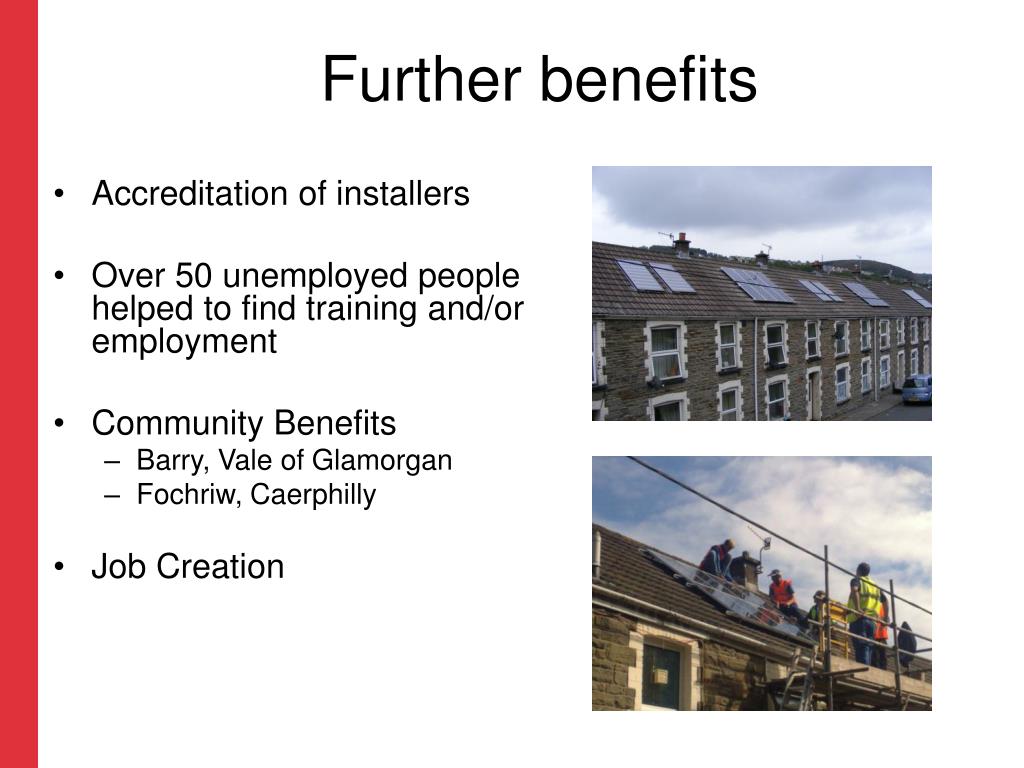 Further benefits • Accreditation of installers • Over 50 unemployed people helped to find training and/or employment • Community Benefits • Barry, Vale of Glamorgan • Fochriw, Caerphilly • Job Creation