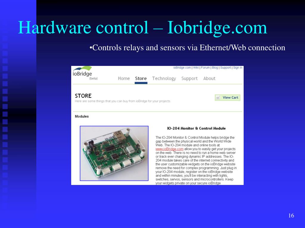 Hardware control – Iobridge.com • Controls relays and sensors via Ethernet/Web connection