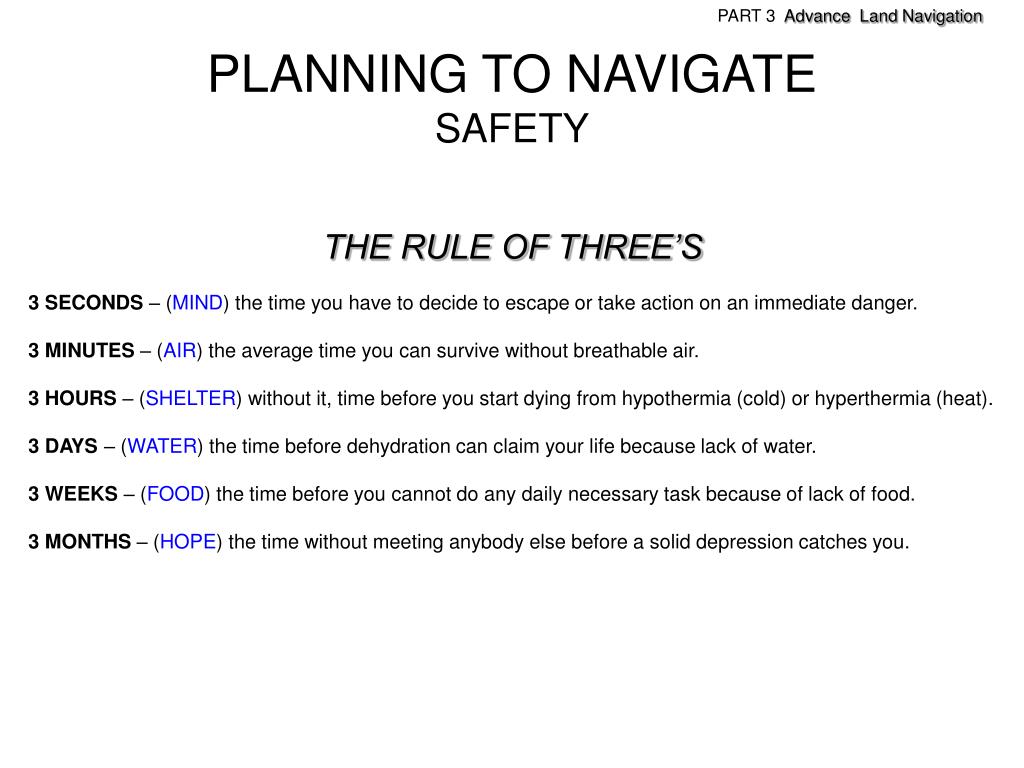 PART 3 Advance Land Navigation PLANNING TO NAVIGATESAFETY THE RULE OF THREE’S 3 SECONDS – (MIND) the time you have to decide to escape or take action on an immediate danger. 3 MINUTES – (AIR) the average time you can survive without breathable air. 3 HOURS – (SHELTER) without it, time before you start dying from hypothermia (cold) or hyperthermia (heat). 3 DAYS – (WATER) the time before dehydration can claim your life because lack of water. 3 WEEKS – (FOOD) the time before you cannot do any daily necessary task because of lack of food. 3 MONTHS – (HOPE) the time without meeting anybody else before a solid depression catches you.