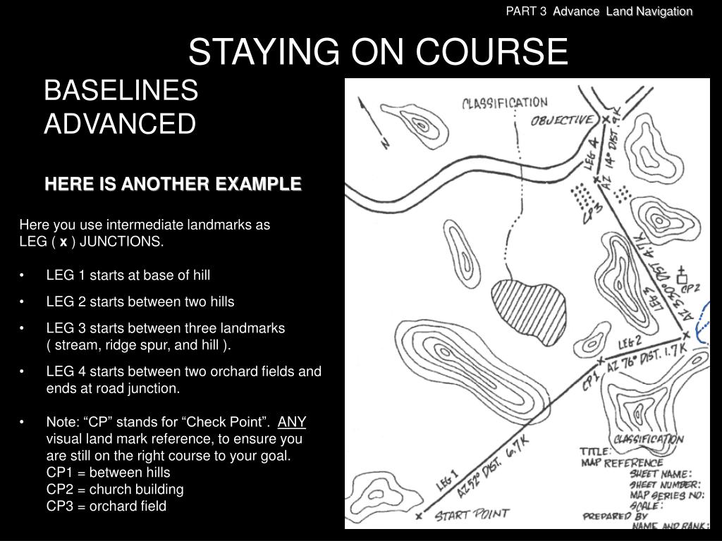 PART 3 Advance Land Navigation STAYING ON COURSEBASELINESADVANCED • HERE IS ANOTHER EXAMPLE • Here you use intermediate landmarks as • LEG ( x ) JUNCTIONS. • LEG 1 starts at base of hill • LEG 2 starts between two hills • LEG 3 starts between three landmarks • ( stream, ridge spur, and hill ). • LEG 4 starts between two orchard fields and ends at road junction. • Note: “CP” stands for “Check Point”. ANY visual land mark reference, to ensure you are still on the right course to your goal. • CP1 = between hills • CP2 = church building • CP3 = orchard field