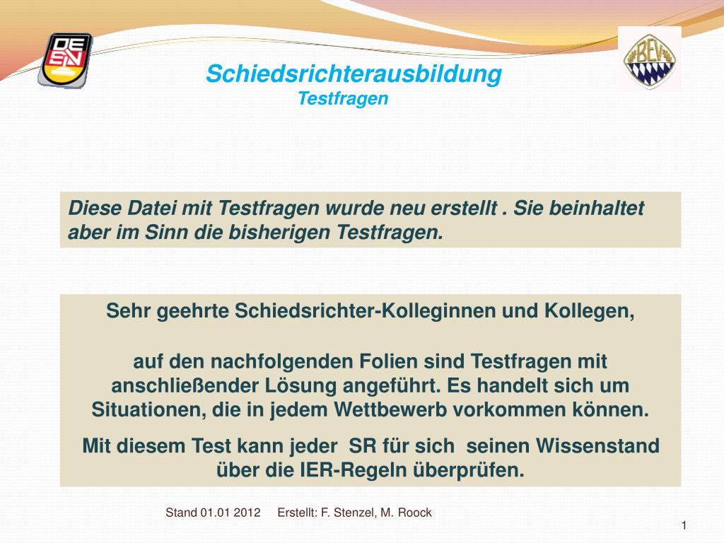 Schiedsrichterausbildung Testfragen Diese Datei mit Testfragen wurde neu erstellt . Sie beinhaltet aber im Sinn die bisherigen Testfragen. Sehr geehrte Schiedsrichter-Kolleginnen und Kollegen, auf den nachfolgenden Folien sind Testfragen mit anschließender Lösung angeführt. Es handelt sich um Situationen, die in jedem Wettbewerb vorkommen können. Mit diesem Test kann jeder SR für sich seinen Wissenstand über die IER-Regeln überprüfen. Stand 01.01 2012 Erstellt: F. Stenzel, M. Roock