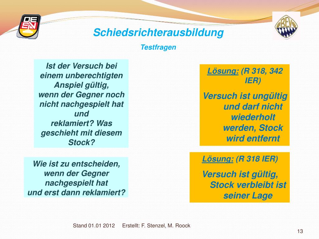 Schiedsrichterausbildung Testfragen Ist der Versuch bei einem unberechtigten Anspiel gültig, wenn der Gegner noch nicht nachgespielt hat und reklamiert? Was geschieht mit diesem Stock? Lösung: (R 318, 342 IER) Versuch ist ungültig und darf nicht wiederholt werden, Stock wird entfernt Lösung: (R 318 IER) Versuch ist gültig, Stock verbleibt ist seiner Lage Wie ist zu entscheiden, wenn der Gegner nachgespielt hat und erst dann reklamiert? Stand 01.01 2012 Erstellt: F. Stenzel, M. Roock