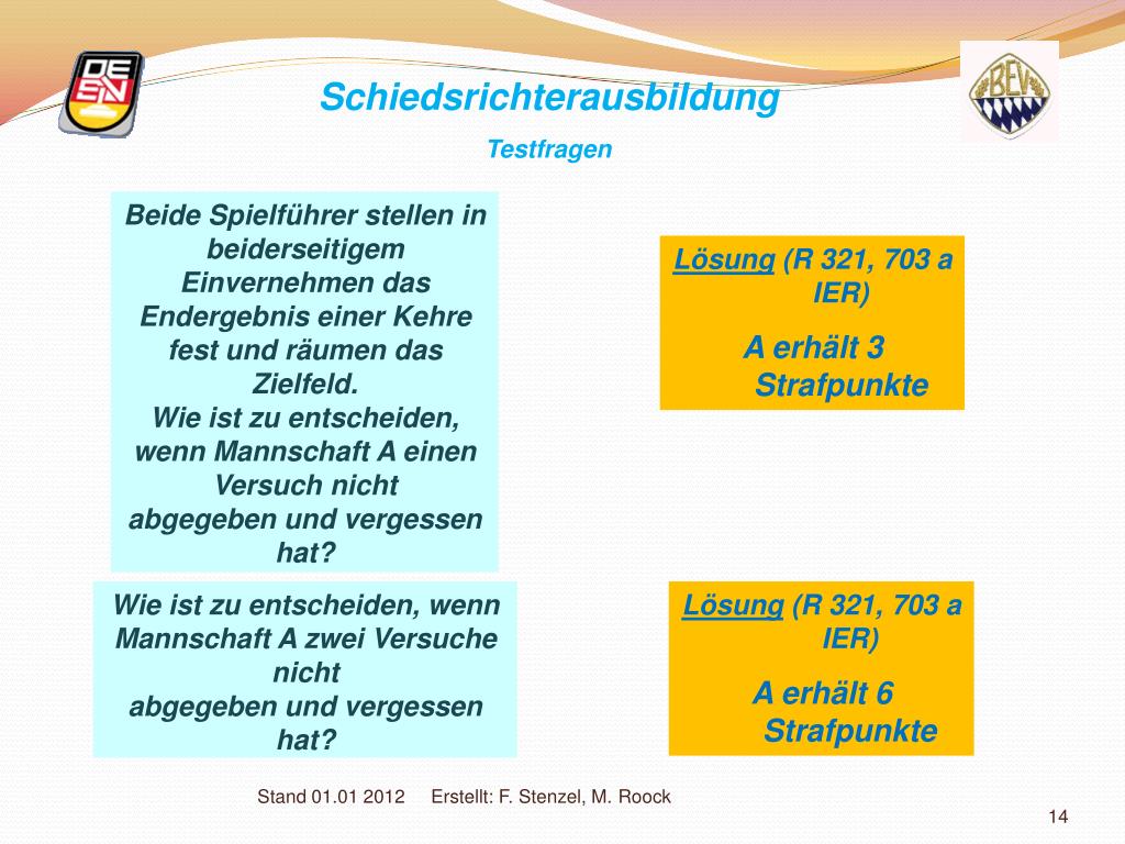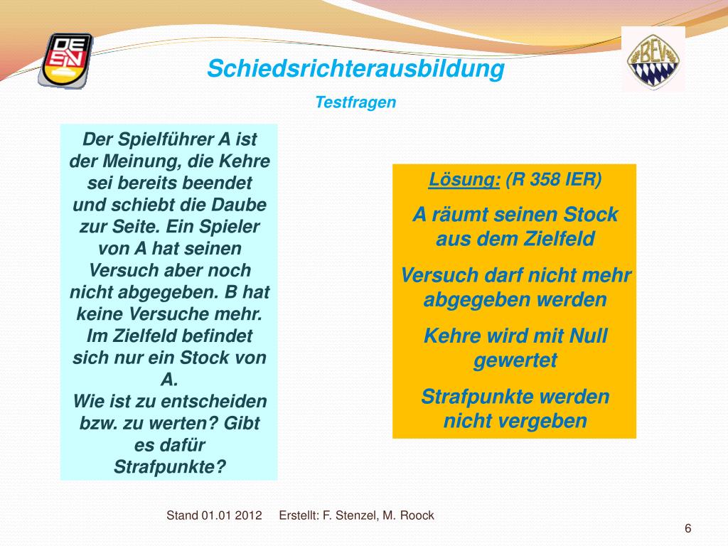 Schiedsrichterausbildung Testfragen Das vorletzte Spiel eines Turnieres wurde von Ihnen angepfiffen. Auf Bahn 1 sind von der Mannschaft, die das vorangegangene Spiel aussetzte, nur zwei Spieler auf dem Spielfeld. Die beiden anderen sind noch in der Kantine. Wie ist zu entscheiden? Lösung: (R 303, 304 IER) die Mannschaft scheidet aus dem Wettbewerb aus ihre gesamten bisherigen Spiele werden nicht gewertet Stand 01.01 2012 Erstellt: F. Stenzel, M. Roock