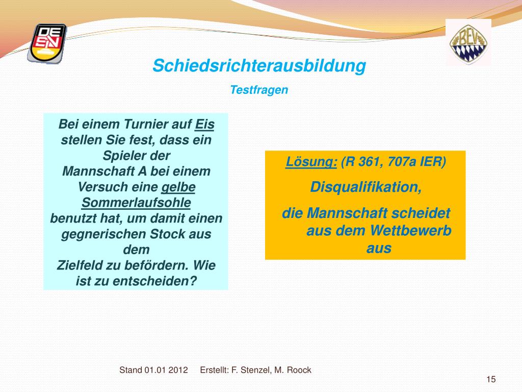 Schiedsrichterausbildung Testfragen Bei einem Turnier auf Eis stellen Sie fest, dass ein Spieler der Mannschaft A bei einem Versuch eine gelbe Sommerlaufsohle benutzt hat, um damit einen gegnerischen Stock aus dem Zielfeld zu befördern. Wie ist zu entscheiden? Lösung: (R 361, 707a IER) Disqualifikation, die Mannschaft scheidet aus dem Wettbewerb aus Stand 01.01 2012 Erstellt: F. Stenzel, M. Roock
