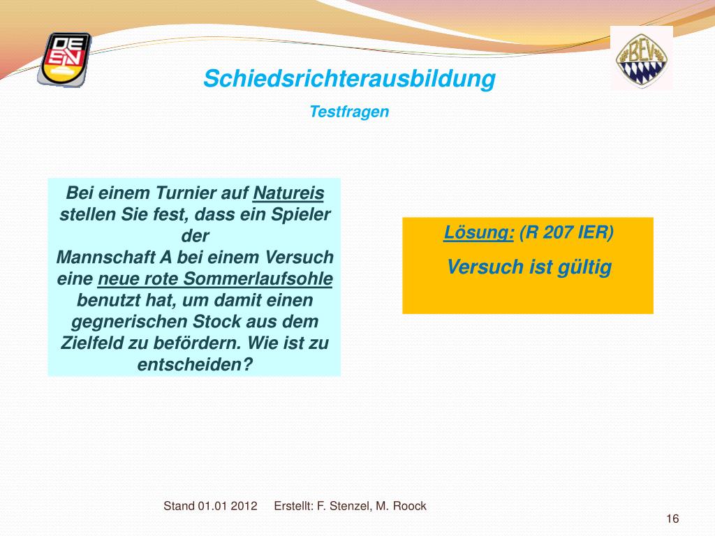 Schiedsrichterausbildung Testfragen Bei einem Turnier auf Natureis stellen Sie fest, dass ein Spieler der Mannschaft A bei einem Versuch eine neue rote Sommerlaufsohle benutzt hat, um damit einen gegnerischen Stock aus dem Zielfeld zu befördern. Wie ist zu entscheiden? Lösung: (R 207 IER) Versuch ist gültig Stand 01.01 2012 Erstellt: F. Stenzel, M. Roock