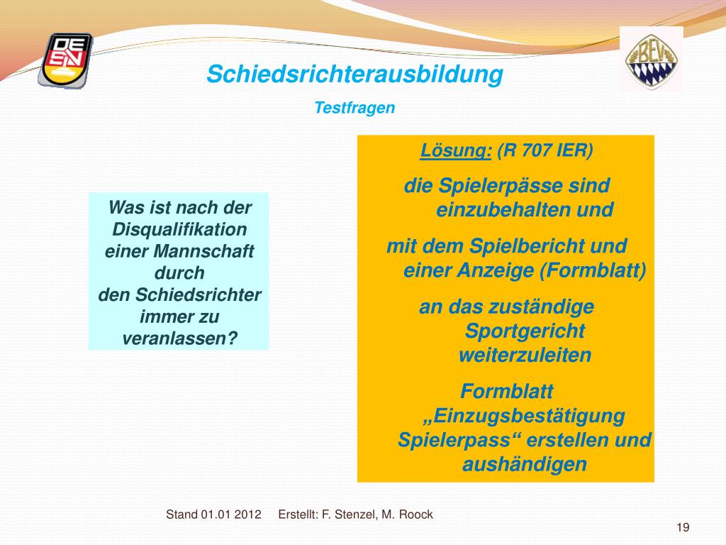Schiedsrichterausbildung Testfragen Lösung: (R 707 IER) die Spielerpässe sind einzubehalten und mit dem Spielbericht und einer Anzeige (Formblatt) an das zuständige Sportgericht weiterzuleiten Formblatt „Einzugsbestätigung Spielerpass“ erstellen und aushändigen Was ist nach der Disqualifikation einer Mannschaft durch den Schiedsrichter immer zu veranlassen? Stand 01.01 2012 Erstellt: F. Stenzel, M. Roock