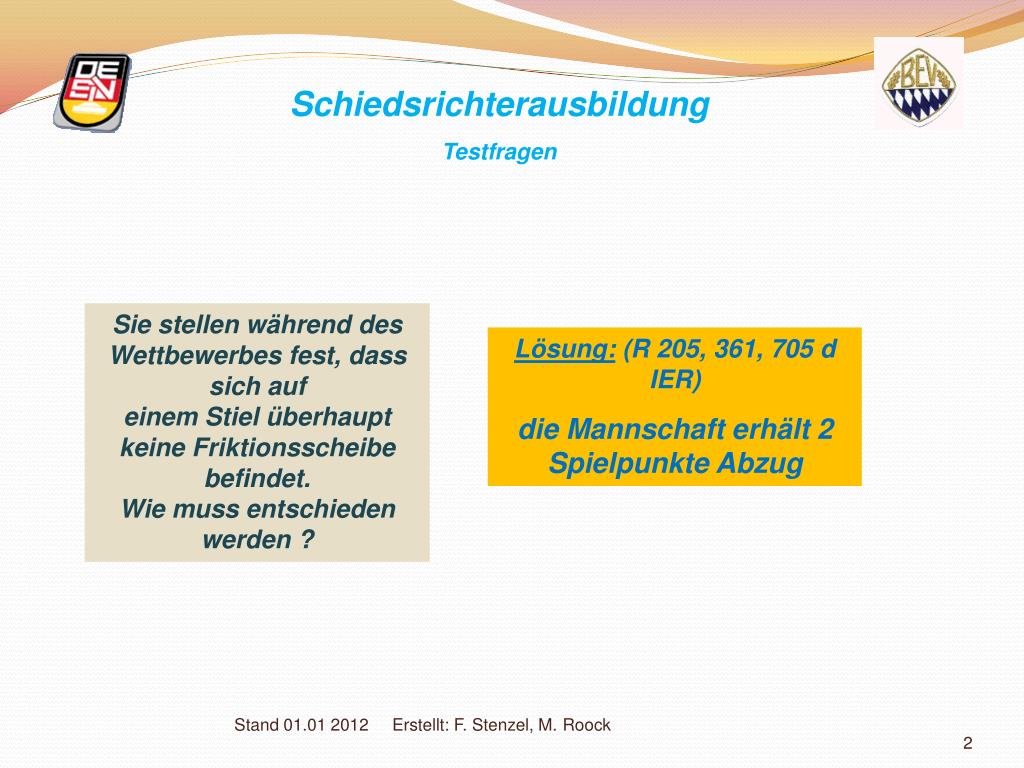 Schiedsrichterausbildung Testfragen Sie stellen während des Wettbewerbes fest, dass sich auf einem Stiel überhaupt keine Friktionsscheibe befindet. Wie muss entschieden werden ? Lösung: (R 205, 361, 705 d IER) die Mannschaft erhält 2 Spielpunkte Abzug Stand 01.01 2012 Erstellt: F. Stenzel, M. Roock