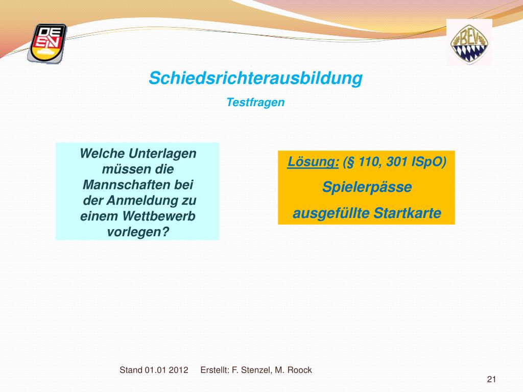 Schiedsrichterausbildung Testfragen Welche Unterlagen müssen die Mannschaften bei der Anmeldung zu einem Wettbewerb vorlegen? Lösung: (§ 110, 301 ISpO) Spielerpässe ausgefüllte Startkarte Stand 01.01 2012 Erstellt: F. Stenzel, M. Roock