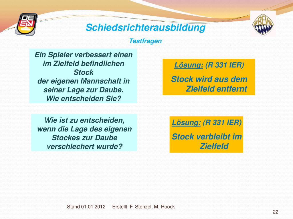 Schiedsrichterausbildung Testfragen Ein Spieler verbessert einen im Zielfeld befindlichen Stock der gegnerischen Mannschaft in seiner Lage zur Daube. Wie entscheiden Sie? Lösung: (R 332 IER) Stock verbleibt in dieser Lage Wie ist zu entscheiden, wenn die Lage des gegnerischen Stockes zur Daube verschlechert wurde? Lösung: (R 332 IER) Stock kommt auf seinen alten Platz zurück Stand 01.01 2012 Erstellt: F. Stenzel, M. Roock