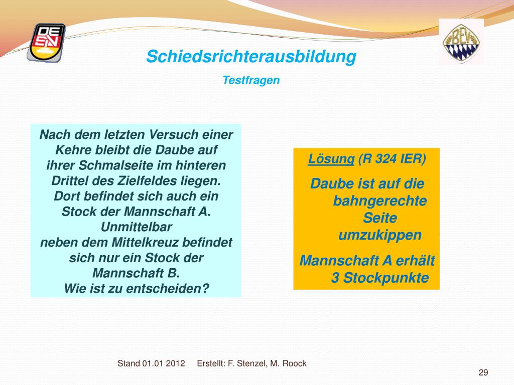 Schiedsrichterausbildung Testfragen Nach einem Versuch stellen Sie fest, dass die Daube auf der Schmalseite im Spielfeld liegen geblieben ist. Wie müssen Sie tun? Lösung: (R 324 IER) Die Daube ist auf die bahngerechte Seite umzukippen. Stand 01.01 2012 Erstellt: F. Stenzel, M. Roock