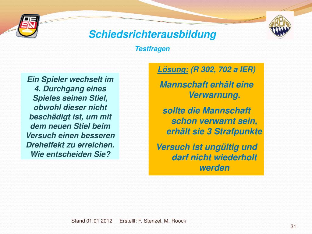 Schiedsrichterausbildung Testfragen Lösung: (R 302, 702 a IER) Mannschaft erhält eine Verwarnung. sollte die Mannschaft schon verwarnt sein, erhält sie 3 Strafpunkte Versuch ist ungültig und darf nicht wiederholt werden Ein Spieler wechselt im 4. Durchgang eines Spieles seinen Stiel, obwohl dieser nicht beschädigt ist, um mit dem neuen Stiel beim Versuch einen besseren Dreheffekt zu erreichen. Wie entscheiden Sie? Stand 01.01 2012 Erstellt: F. Stenzel, M. Roock