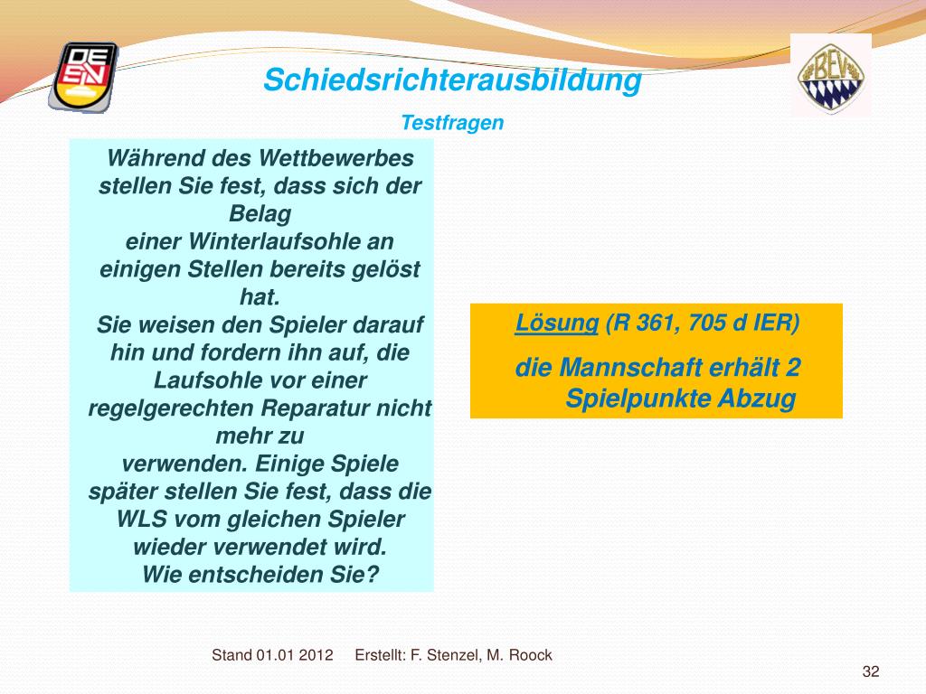Schiedsrichterausbildung Testfragen Während des Wettbewerbes stellen Sie fest, dass sich der Belag einer Winterlaufsohle an einigen Stellen bereits gelöst hat. Sie weisen den Spieler darauf hin und fordern ihn auf, die Laufsohle vor einer regelgerechten Reparatur nicht mehr zu verwenden. Einige Spiele später stellen Sie fest, dass die WLS vom gleichen Spieler wieder verwendet wird. Wie entscheiden Sie? Lösung (R 361, 705 d IER) die Mannschaft erhält 2 Spielpunkte Abzug Stand 01.01 2012 Erstellt: F. Stenzel, M. Roock
