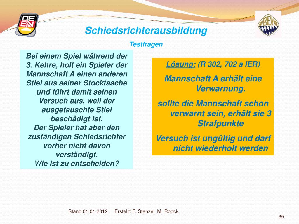 Schiedsrichterausbildung Testfragen Bei einem Spiel während der 3. Kehre, holt ein Spieler der Mannschaft A einen anderen Stiel aus seiner Stocktasche und führt damit seinen Versuch aus, weil der ausgetauschte Stiel beschädigt ist. Der Spieler hat aber den zuständigen Schiedsrichter vorher nicht davon verständigt. Wie ist zu entscheiden? Lösung: (R 302, 702 a IER) Mannschaft A erhält eine Verwarnung. sollte die Mannschaft schon verwarnt sein, erhält sie 3 Strafpunkte Versuch ist ungültig und darf nicht wiederholt werden Stand 01.01 2012 Erstellt: F. Stenzel, M. Roock