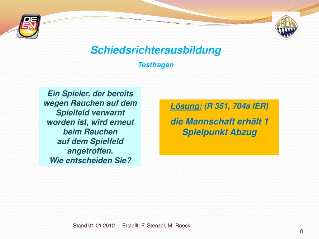 Schiedsrichterausbildung Testfragen Ein Spieler, der bereits wegen Rauchen auf dem Spielfeld verwarnt worden ist, wird erneut beim Rauchen auf dem Spielfeld angetroffen. Wie entscheiden Sie? Lösung: (R 351, 704a IER) die Mannschaft erhält 1 Spielpunkt Abzug Stand 01.01 2012 Erstellt: F. Stenzel, M. Roock