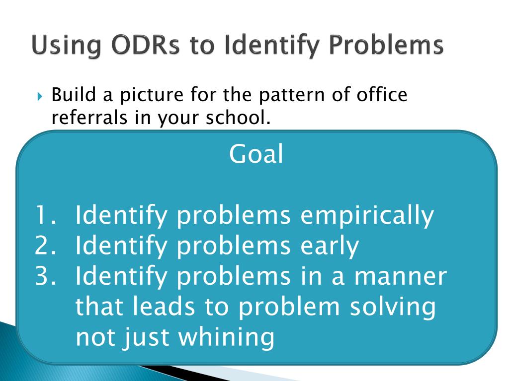 Primary Problem Statements examples • Our average Major ODRs per school day per month are higher than national average for a school of our enrollment size • Our average ODRs per school day per month are higher this year than for corresponding months of previous year • Our average ODRs per school day per month are showing an increasing trend • Faculty, parents, and students say our ODR levels are too high