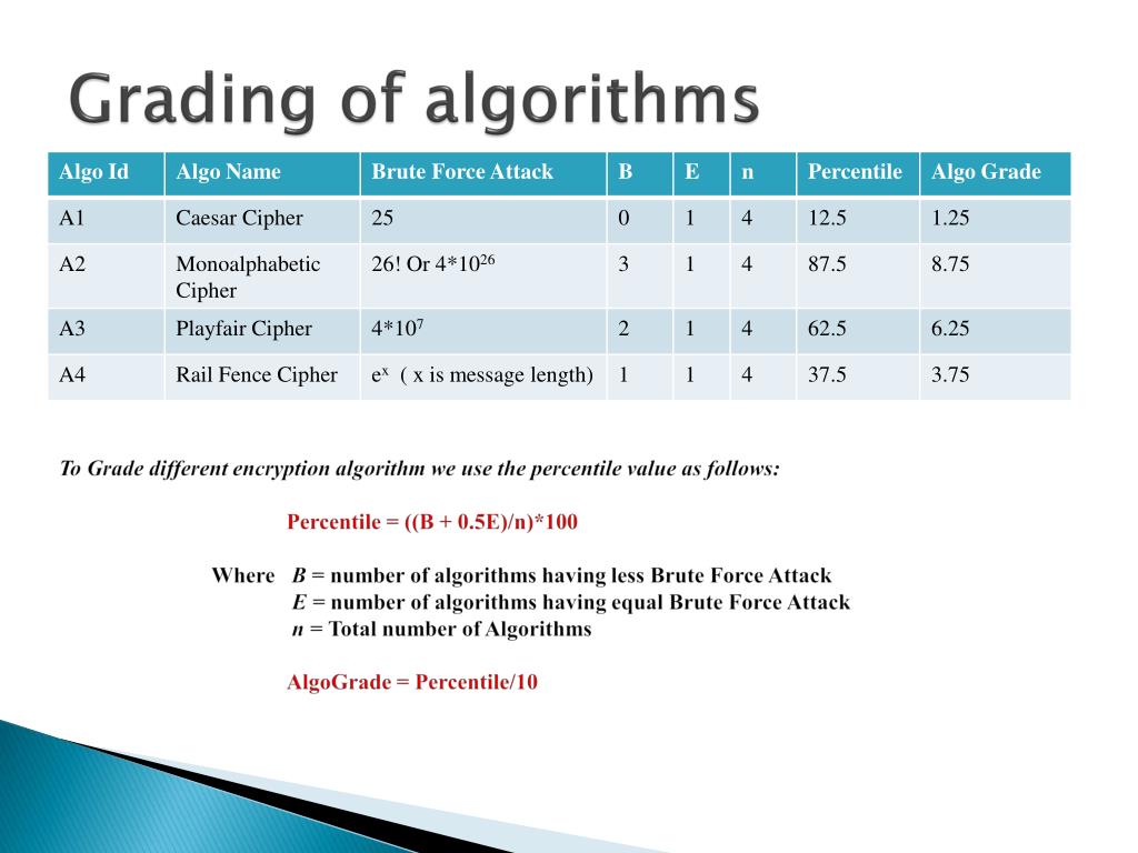 Grading of algorithms • To Grade different encryption algorithm we use the percentile value as follows: • Percentile = ((B + 0.5E)/n)*100 • Where B = number of algorithms having less Brute Force Attack E = number of algorithms having equal Brute Force Attack n = Total number of Algorithms • AlgoGrade = Percentile/10