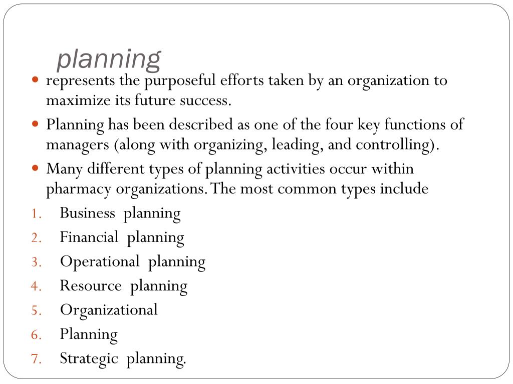 planning • represents the purposeful efforts taken by an organization to maximize its future success. • Planning has been described as one of the four key functions of managers (along with organizing, leading, and controlling). • Many different types of planning activities occur within pharmacy organizations. The most common types include • Business planning • Financial planning • Operational planning • Resource planning • Organizational • Planning • Strategic planning.