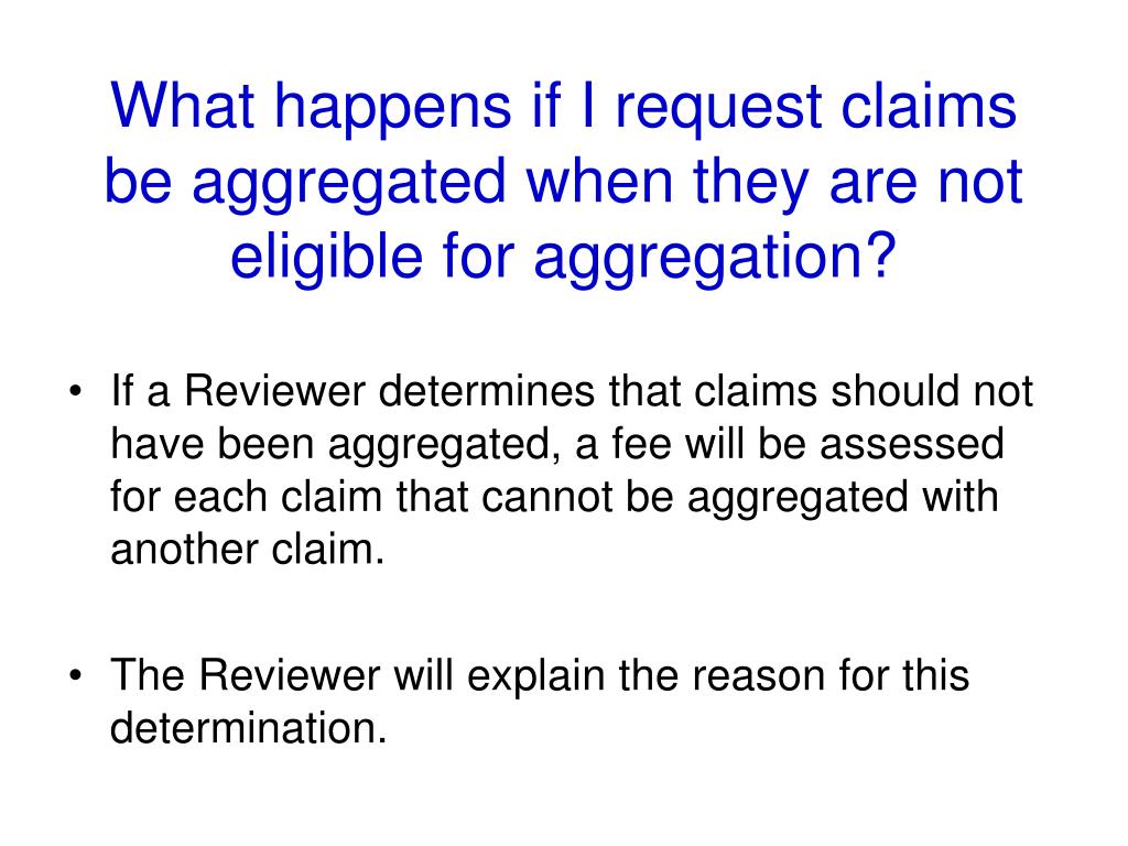 What happens if I request claims be aggregated when they are not eligible for aggregation? • If a Reviewer determines that claims should not have been aggregated, a fee will be assessed for each claim that cannot be aggregated with another claim. • The Reviewer will explain the reason for this determination.