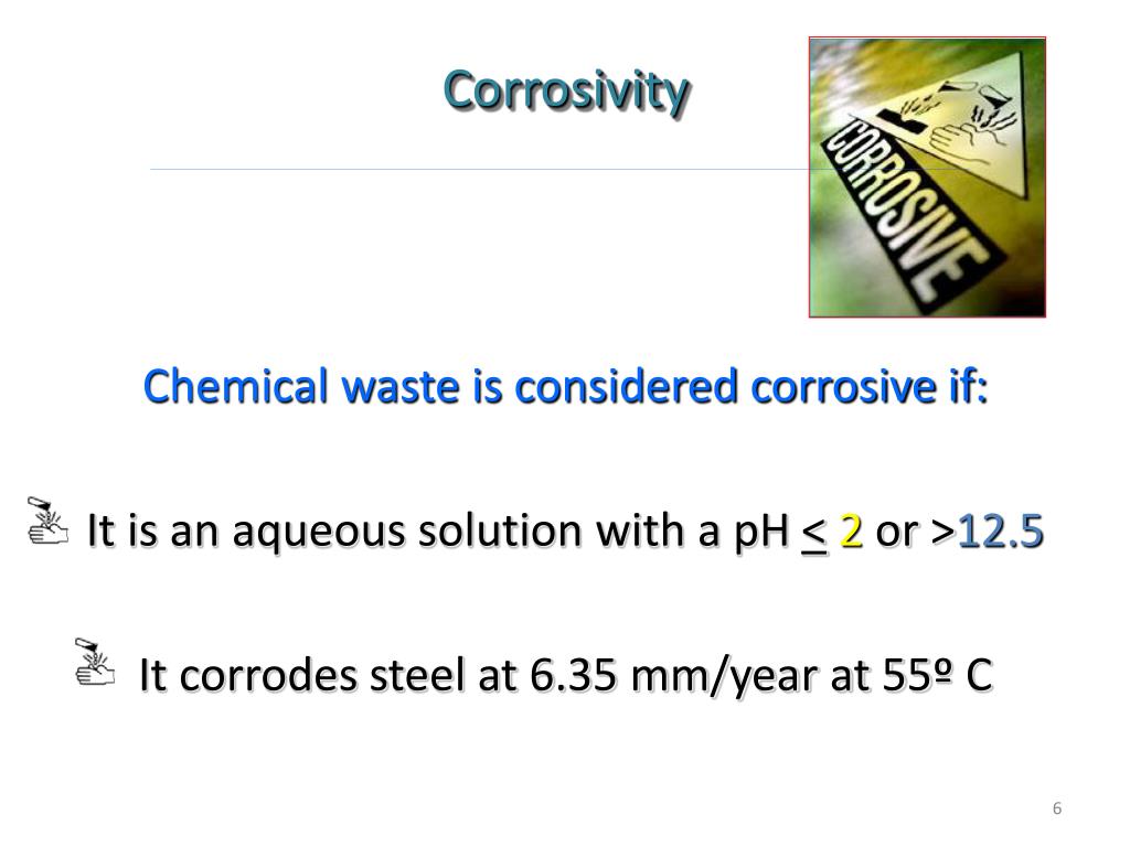Corrosivity Chemical waste is considered corrosive if: It is an aqueous solution with a pH <2 or >12.5 It corrodes steel at 6.35 mm/year at 55º C