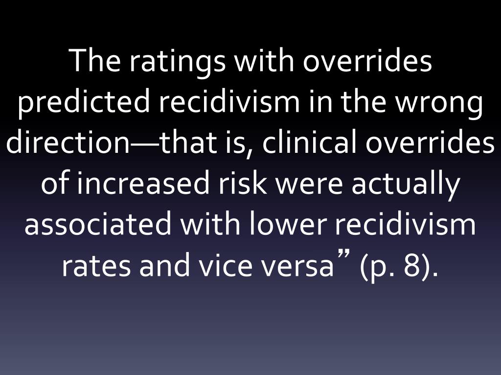 The ratings with overrides predicted recidivism in the wrong direction—that is, clinical overrides of increased risk were actually associated with lower recidivism rates and vice versa” (p. 8).
