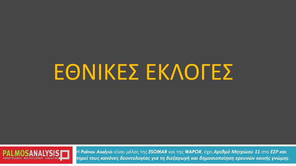 ΕΘΝΙΚΕΣ ΕΚΛΟΓΕΣ Η Palmos Analysisείναι μέλος της ESOMAR και της WAPOR, έχει Αριθμό Μητρώου 11 στο ΕΣΡ και τηρεί τους κανόνες δεοντολογίας για τη διεξαγωγή και δημοσιοποίηση ερευνών κοινής γνώμης.
