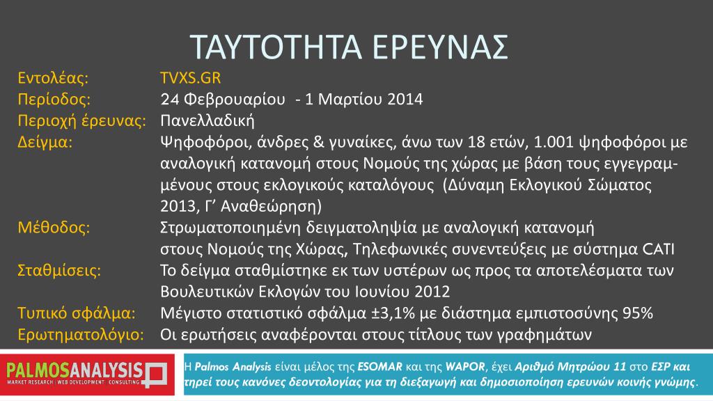 ΠΑΝΕΛΛΑΔΙΚΗ ΠΟΛΙΤΙΚΗ ΕΡΕΥΝΑ Για το TVXS.GR. Η Palmos Analysis είναι μέλος της ESOMAR και της WAPOR και έχει Αριθμό Μητρώου 11 στο Μητρώο Επιχειρήσεων και Φορέων Δημοσκοπήσεων του ΕΣΡ. Εντολέας: TVXS.GR Περίοδος: 24 Φεβρουαρίου - 1 Μαρτίου 2014 Περιοχή έρευνας: Πανελλαδική