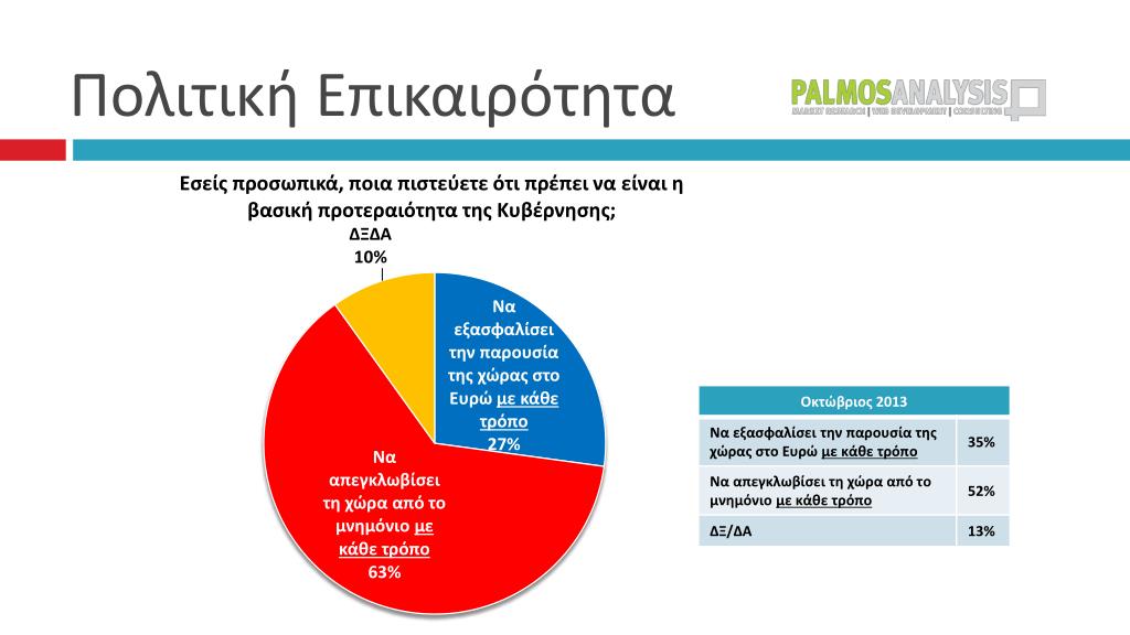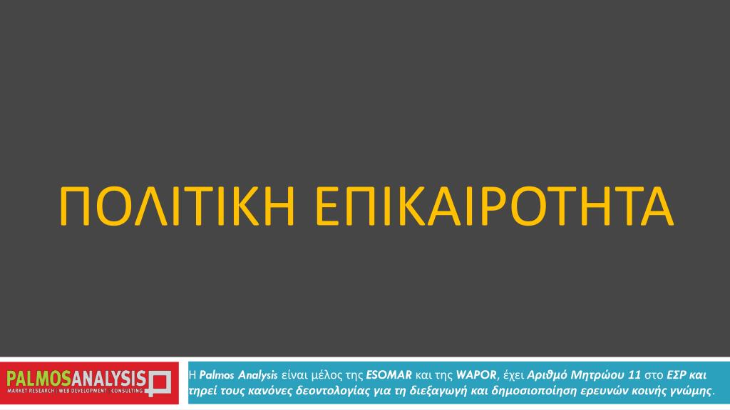 ΠολιτικΗ ΕΠΙΚΑΙΡΟΤΗΤΑ Η Palmos Analysisείναι μέλος της ESOMAR και της WAPOR, έχει Αριθμό Μητρώου 11 στο ΕΣΡ και τηρεί τους κανόνες δεοντολογίας για τη διεξαγωγή και δημοσιοποίηση ερευνών κοινής γνώμης.