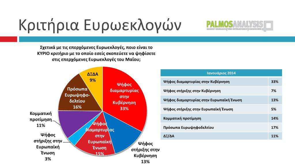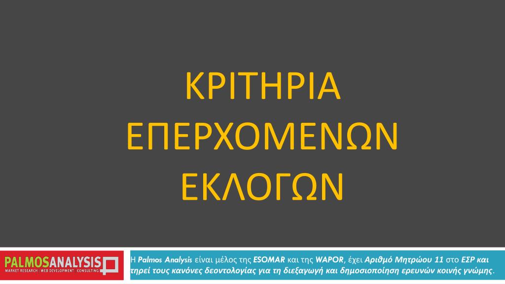 Κριτηρια επερχομενων εκλογων Η Palmos Analysisείναι μέλος της ESOMAR και της WAPOR, έχει Αριθμό Μητρώου 11 στο ΕΣΡ και τηρεί τους κανόνες δεοντολογίας για τη διεξαγωγή και δημοσιοποίηση ερευνών κοινής γνώμης.