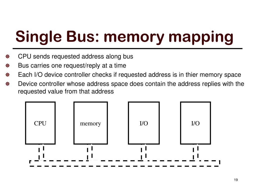 Single Bus: memory mapping • CPU sends requested address along bus • Bus carries one request/reply at a time • Each I/O device controller checks if requested address is in thier memory space • Device controller whose address space does contain the address replies with the requested value from that address CPU memory I/O I/O