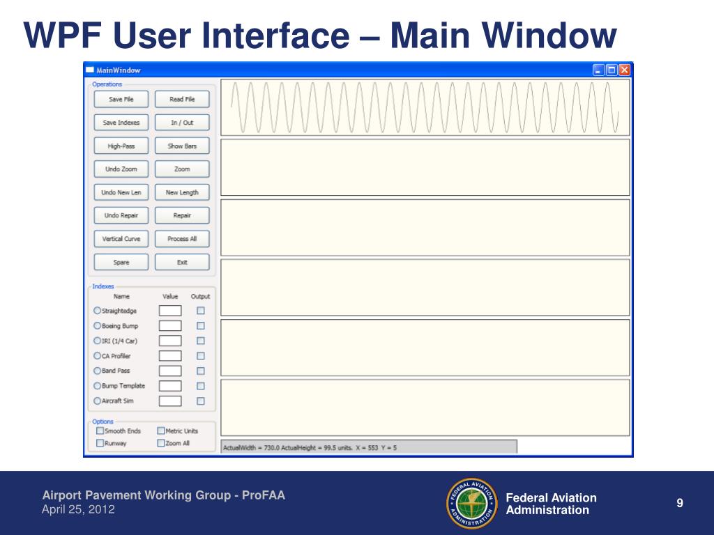 ProFAA Update. Airport Pavement Working Group. Gordon Hayhoe, ANG-E262. Sheraton Atlantic City Convention Center. April 25, 2012. ProFAA Outline. New straightedge modes. Band-pass filter change. New zoom mode. Translation to VB.NET 2010 .
