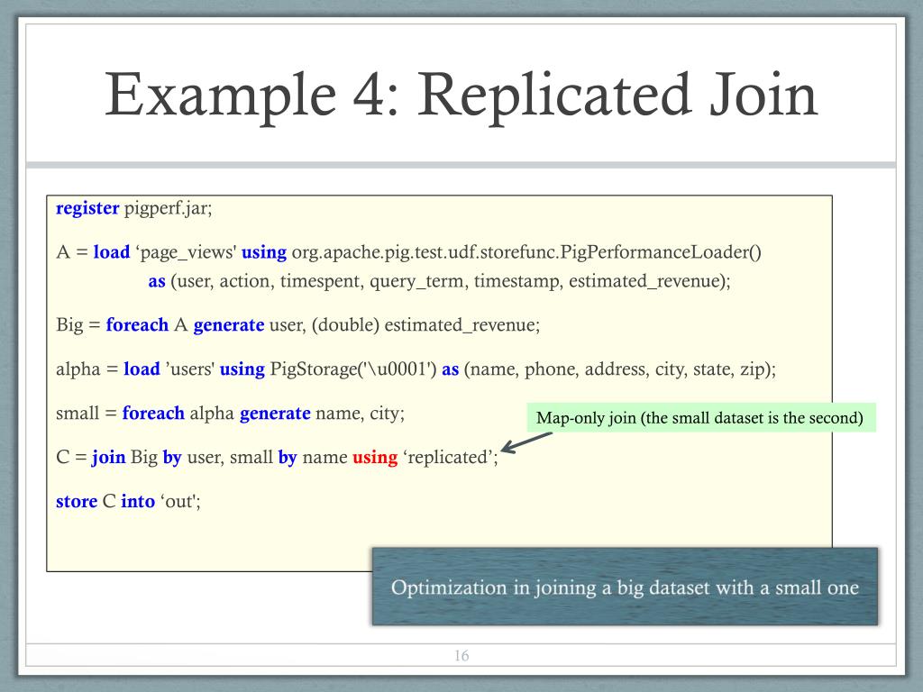 Example 4: Replicated Join registerpigperf.jar; A = load‘page_views' usingorg.apache.pig.test.udf.storefunc.PigPerformanceLoader() as(user, action, timespent, query_term, timestamp, estimated_revenue); Big = foreachA generate user, (double) estimated_revenue; alpha = load’users' usingPigStorage('\u0001') as (name, phone, address, city, state, zip); small = foreachalpha generatename, city; C = joinBig byuser, small byname using ‘replicated’; store C into‘out'; Map-only join (the small dataset is the second) Optimization in joining a big dataset with a small one
